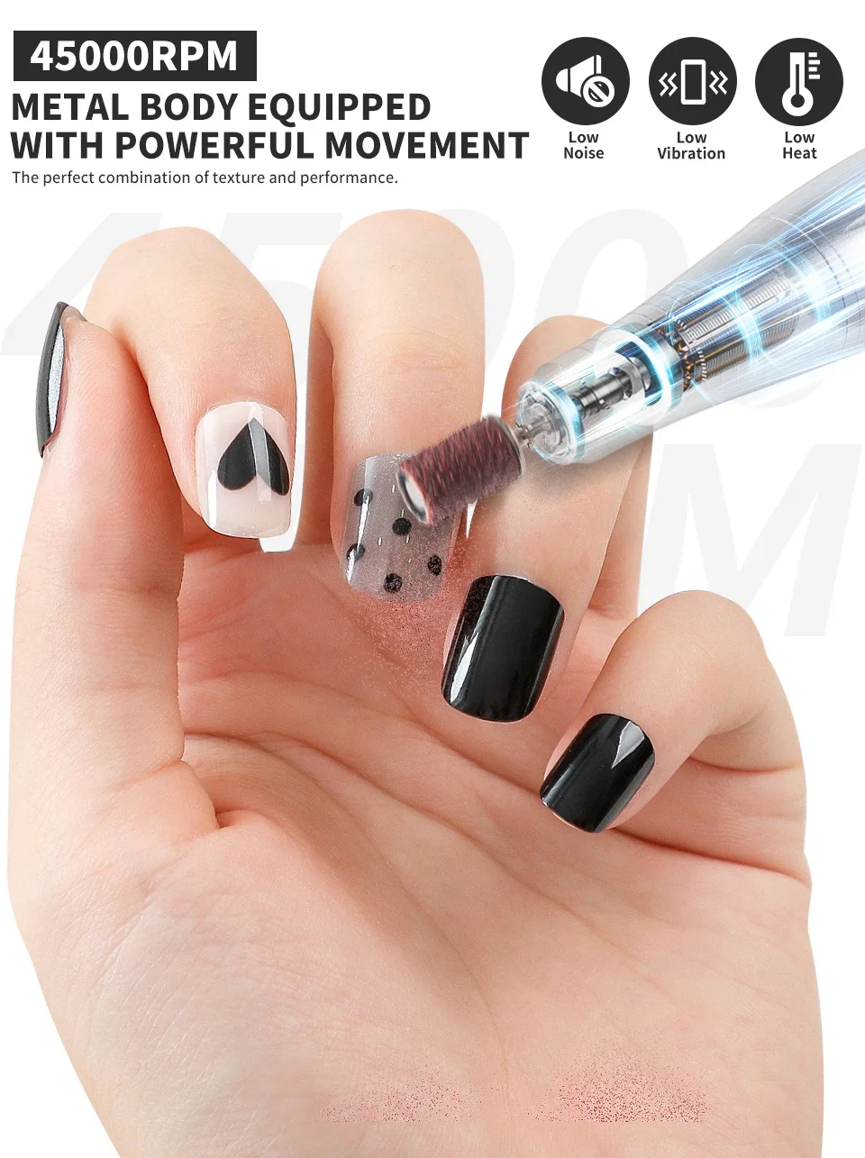 【 Low Heat/Noise】: The professional nail drill for acrylic nails is designed with a brushless motor, aluminum alloy body, high-quality bearings and internal cooling system.